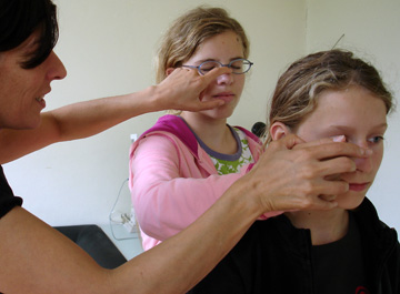 4. tegelijkertijd aait persoon 3 op dezelfde plaats en met exact dezelfde bewegingen de neustop van persoon 1.
